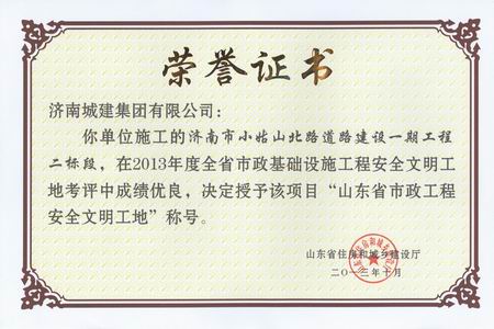 济南市小姑山北路蹊径建设一期工程二标段荣获2013年度山东省市政工程清静文明工地称呼