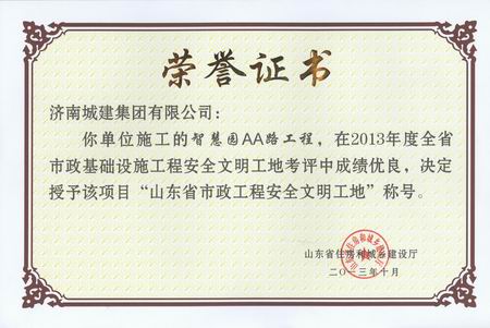 智慧园AA路工程荣获2013年度山东省市政工程清静文明工地称呼