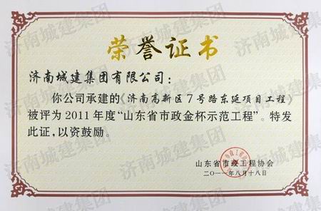济南市高新区7号路东延项目工程被评为2011年度山东省市政金杯树模工程