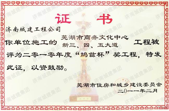 芜湖市商务文化中心新三、四、五大道工程被评为2010年度鸠兹杯奖工程