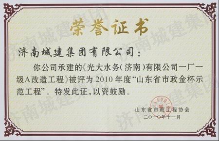 光洪流务(济南)有限公司一厂一级A刷新工程被评为2010年度山东省市政金杯树模工程