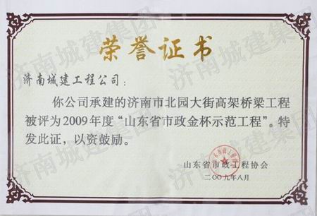 济南市北园大街高架桥梁工程被评为2009年度山东省市政金杯树模工程