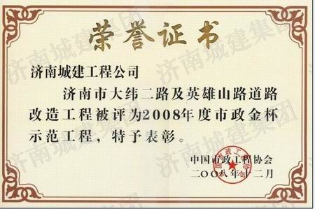 济南市济微路建设工程被评为2008年度天下市政金杯树模工程