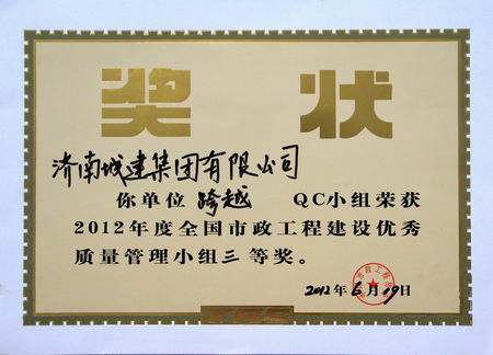 “跨越”QC小组荣获2012年度天下市政工程建设优异质量治理小组三等奖