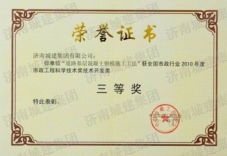 蹊径下层混凝土侧模施工工法荣获2010年度市政工程科学手艺奖手艺开发类三等奖
